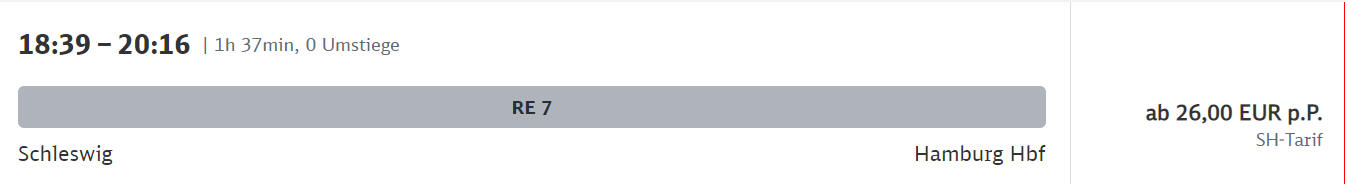 z.B. 18:39 ab Schleswig - An Hamburg Hbf ohne Umsteigen 20:16 Uhr - Fahrzeit 1h