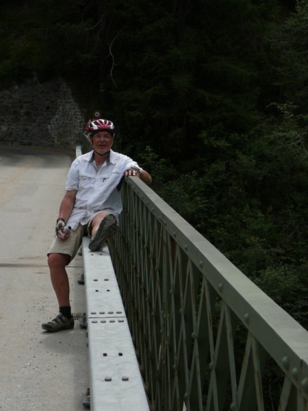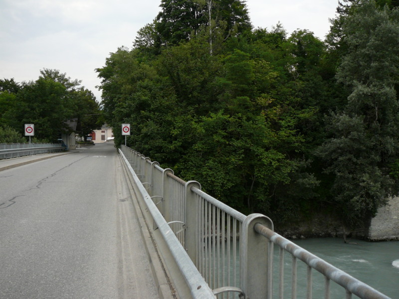 Morgens Die Fahrt ging direkt vom Campingplatz herunter über einen Moutainbike-Weg unbestestigt - nicht geeignet für Reiseräder mit Anhänger - falscher Weg!. An der Landstraße hätte man das Rheinufer wechseln müssen - linksrheinisch geht die Veloroute 2 weiter. Für uns ging es erst mal wieder auf 1100m Höhe hinauf, zwar asphaltiert, aber in einem schlechten Zustand. Wieder unbefestigt ging es am rechten Rheinufer weiter. Schöne Strecke, aber schlecht zu fahren. Es geht links und rechts auf schmalen Wegen (nur für Fußgänger und Radfahrer) zwischen Bäumen hin und her und das ständig bergab. Ich hatte keine Zeit die Landschaft zu genießen, da man ständig konzentriert sein musste, da ab und zu plötzlich Gegenverkehr auftauchte. |